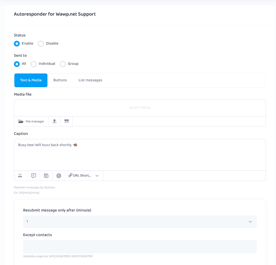• You can random message by Spintax: {Hi|Hello|Hola}