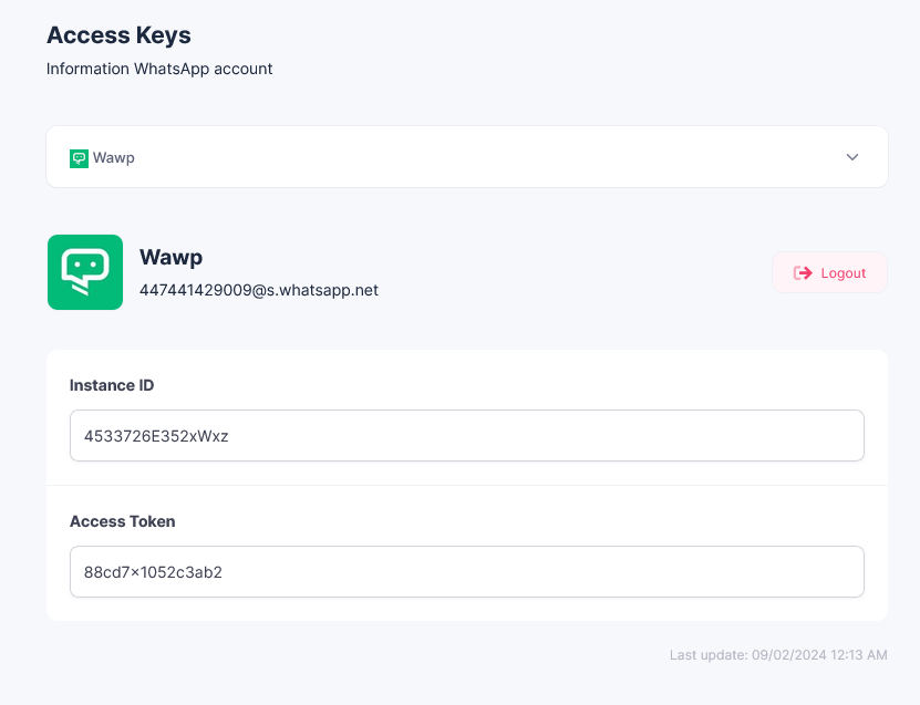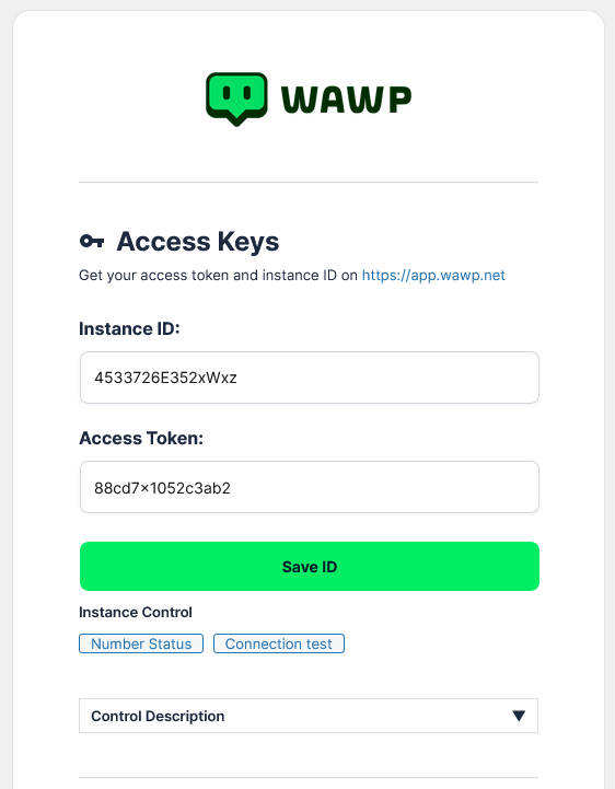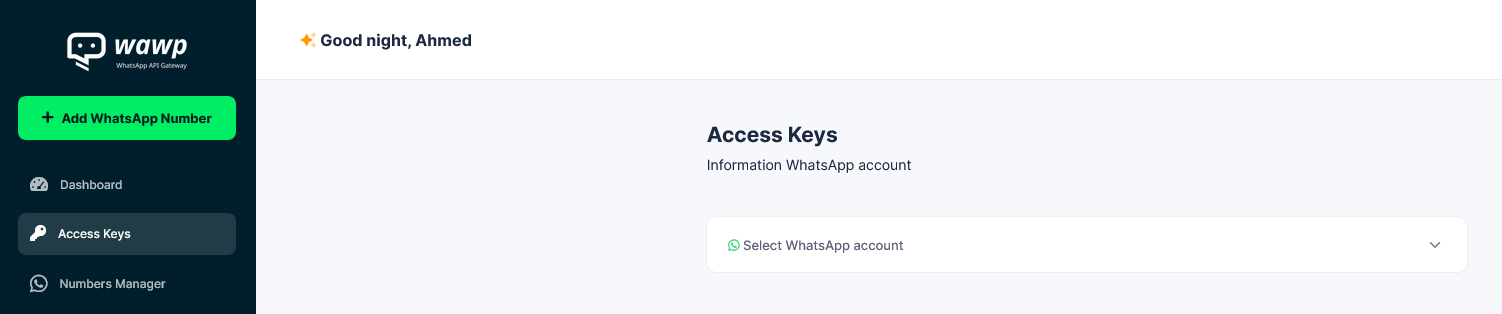 - Through WAWP control panel https://app.1m.wawp.net, go to Access Keys > Select WhatsApp account